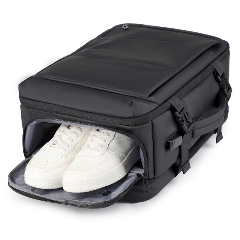 Viaja, estudia o trabaja con total comodidad gracias a esta mochila expandible multifuncional, fabricada en poliéster Oxford resistente al agua y diseñada para maximizar espacio y organización. Cuenta con un amplio compartimiento principal, bolsillo independiente para laptop de hasta 17”, área separada para zapatos, bolsillo seco/húmedo y apertura completa tipo maleta para un acceso rápido. Sus correas ergonómicas, panel trasero acolchado y correa para maleta garantizan confort en todo momento, mientras que el puerto USB externo añade practicidad a tus días. Ideal para viajes, gimnasio o uso diario.